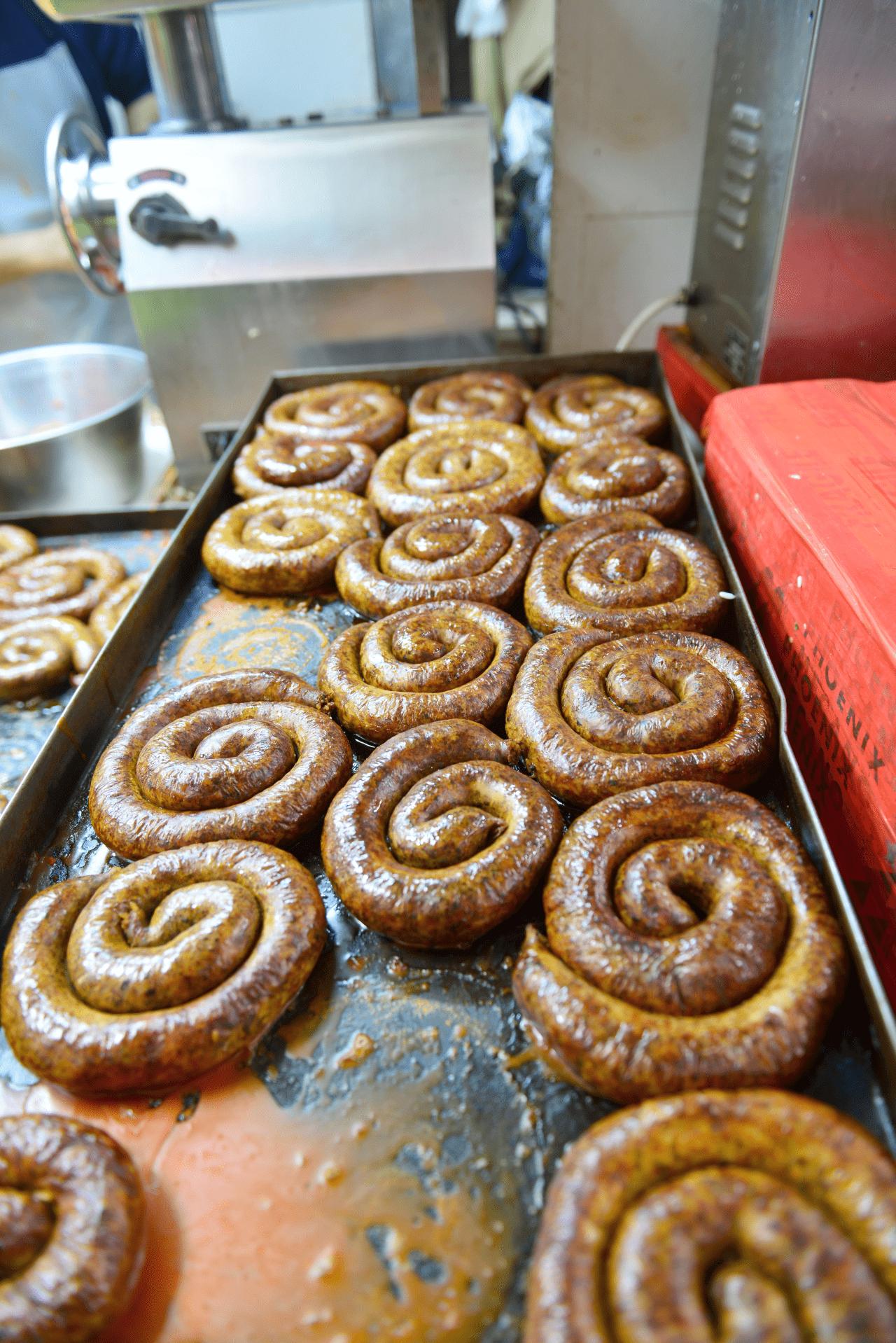 Spezialität scheint eine Art vorgebratene Grützwurst zu sein. Die will probiert werden! Der Schlachter findet den Verzehrmut der weißen Touristen offenbar so beeindruckend das er für die Probierstücke überhaupt kein Geld haben möchte. Auch noch nicht passiert.