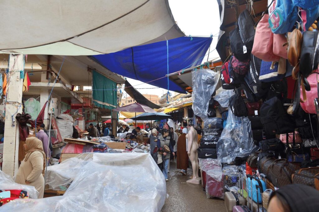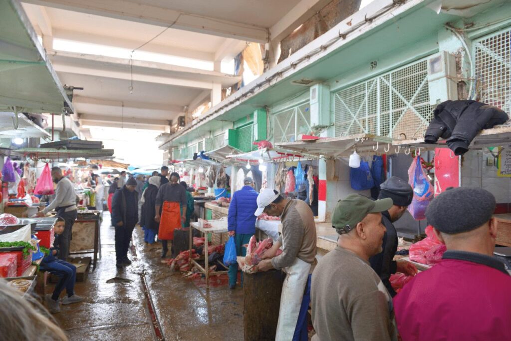 Die ca. 1 Millionen Schuh- und Bekleidungsstände gehen nahtlos über in einen Lebensmittelmarkt. In dessen Zentrum eine große Fischhalle und daneben tote Landtiere aller Art. Drumherum und zwischendurch Obst und Gemüse. Denkt man in Form einer Zwiebel wären die die zweite Schicht, dann halt die anderen Stände mit Klamotten, Schuhe und Haushaltsgegenständen noch drum herum.