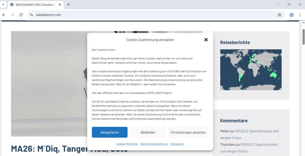 Wird WIEDEKAMM.COM das erste Mal besucht, packt COMPLIANZ ein riesiges Banner über die eigentliche Internetseite und weist auf die Cookie Nummer DGSVO konform hin. Bei WIEDEKAMM.COM ist das Banner sogar noch etwas größer weil sich der schon immer überhebliche Betreiber sich wie doof über diesen hinderlichen Mist aufregt.