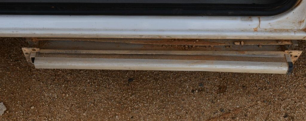 Vermutlich irgendwo aufgesetzt und ein massives Führungsblech so verbogen das die Stufe nicht mehr ausfahren konnte. Einfach mit Gewalt gerade gebogen, funktioniert wieder. Ein Plastikteil der Trittstufe verloren, ein anders zerbrochen. Das zerbrochene konnte geklebt werden, das verlorene wird nicht ersetzt.
