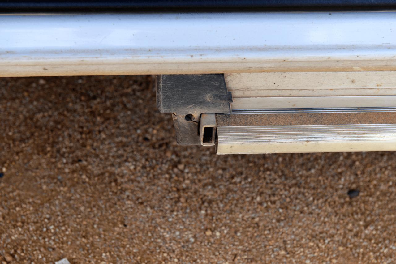 Vermutlich irgendwo aufgesetzt und ein massives Führungsblech so verbogen das die Stufe nicht mehr ausfahren konnte. Einfach mit Gewalt gerade gebogen, funktioniert wieder. Ein Plastikteil der Trittstufe verloren, ein anders zerbrochen. Das zerbrochene konnte geklebt werden, das verlorene wird nicht ersetzt.
