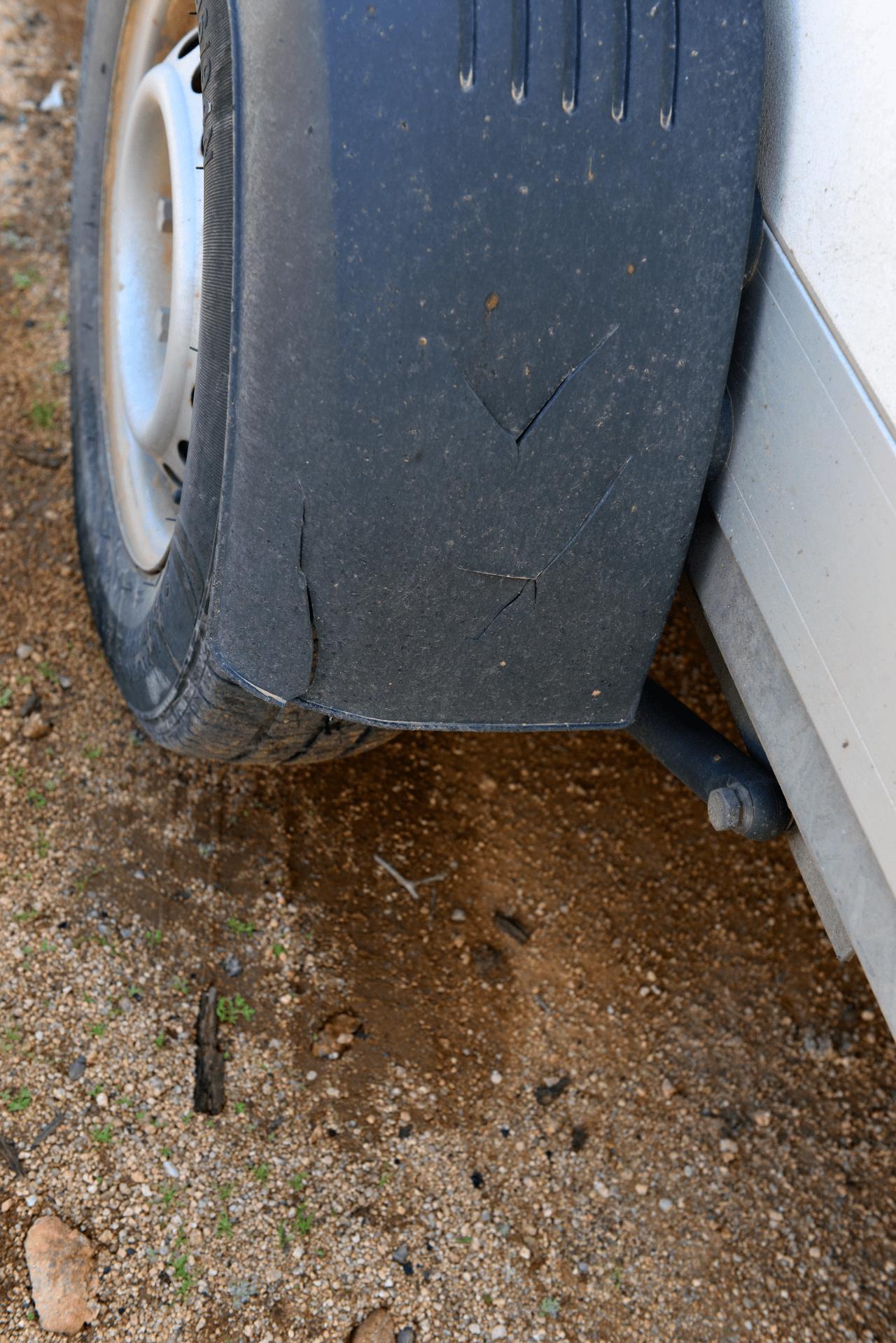 Rechter Radkotflügel aus Kunststoff zerbrochen, vermutlich durch Steinschlag (?). Mit Klebeband geflickt, wird nun durch ein Neuteil ersetzt.