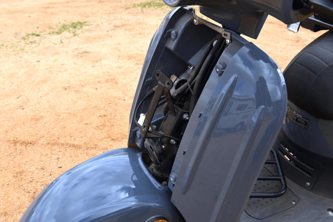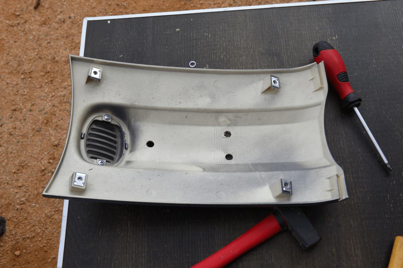 Die vorderen Zurrgurte haben die Kunststoffverkleidung des Motorrollers aus seiner Position gerissen. Vermutlich die Zurrgurte zu stark gespannt gepaart mit starker Erschütterung bei dem Offraod Abschnitt SMARA/ZAG. Die Metallhalterung am Roller wurde zurückgebogen und die Schraubenhalterungen der Kunststoffverkleidung konnte geklebt werden.