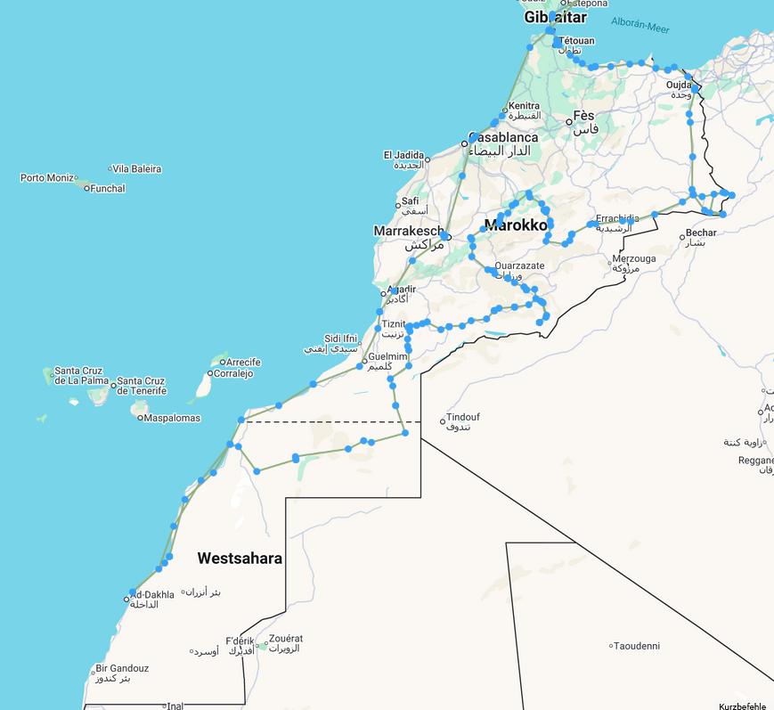 70 Reisetage insgesamt, davon 46 in MAROKKO. Im Land haben wir 6.176 Kilometer mit dem Auto zurück gelegt, die gut 4.000 Kilometer mehr ergeben sich durch die weite Anreise nach ALGECIRAS (SPANIEN) weil die ursprünglich geplante Fähre ab/an SETE (SÜDFRANKREICH) auf der Hinfahrt nicht fuhr.