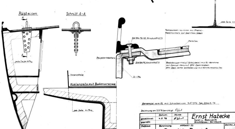 In den Unterlagen zu unserer neuen (alten) Segelyacht „STÖRTEBECKER“ vom Typ HATECKE HORNET 33 haben wir die originalen Bauzeichnungen aus dem Jahr 1976 gefunden. Zu schade, im Schrank ein ungenutztes Dasein zu fristen. Daher hier in zwei Beiträgen die sauber abfotografierten Baupläne. Hier im Teil 2 geht es um den „Bauplan, Rumpf“, klickt man auf eines der Bilder, kommt man […]